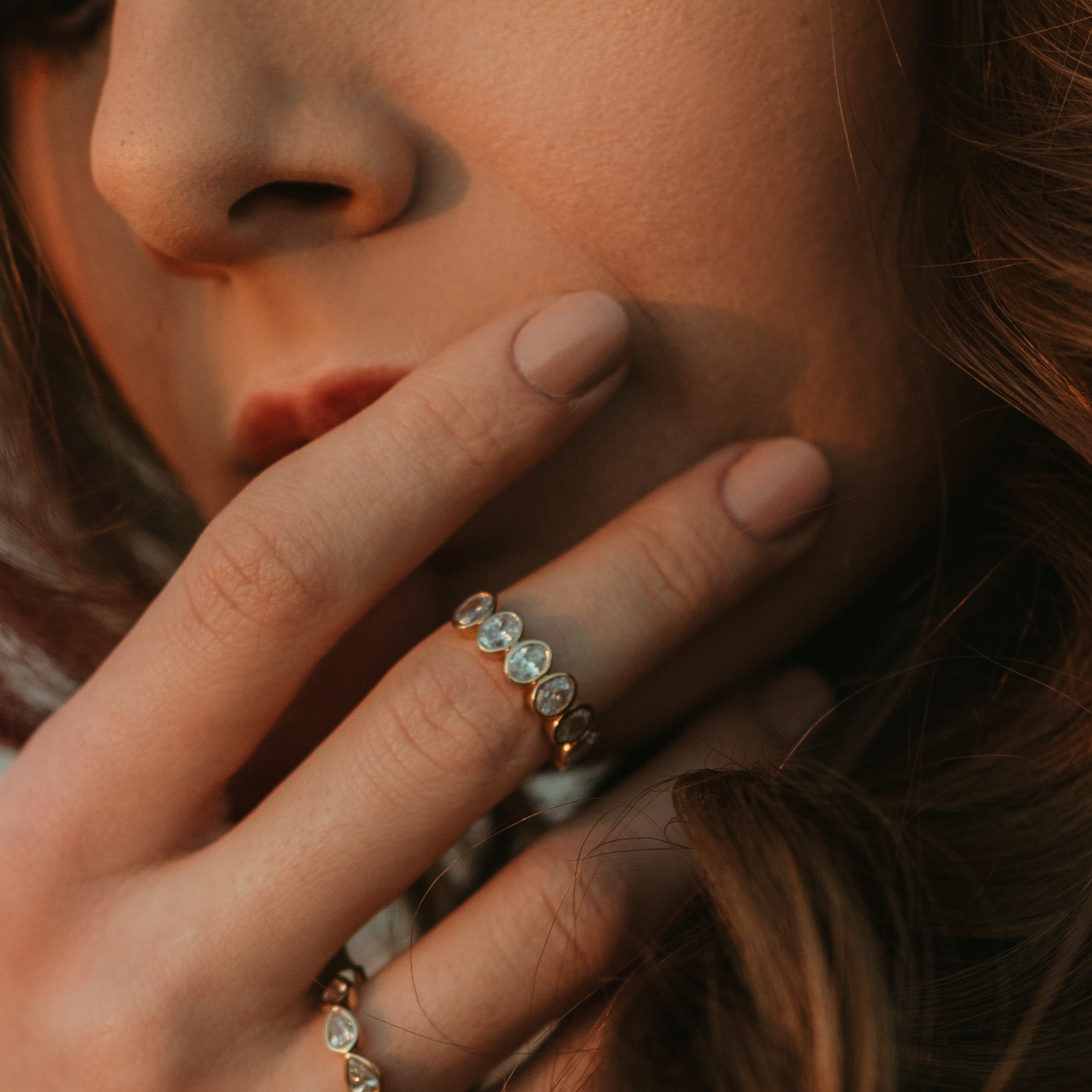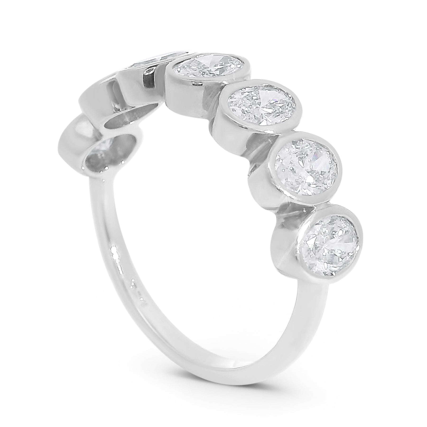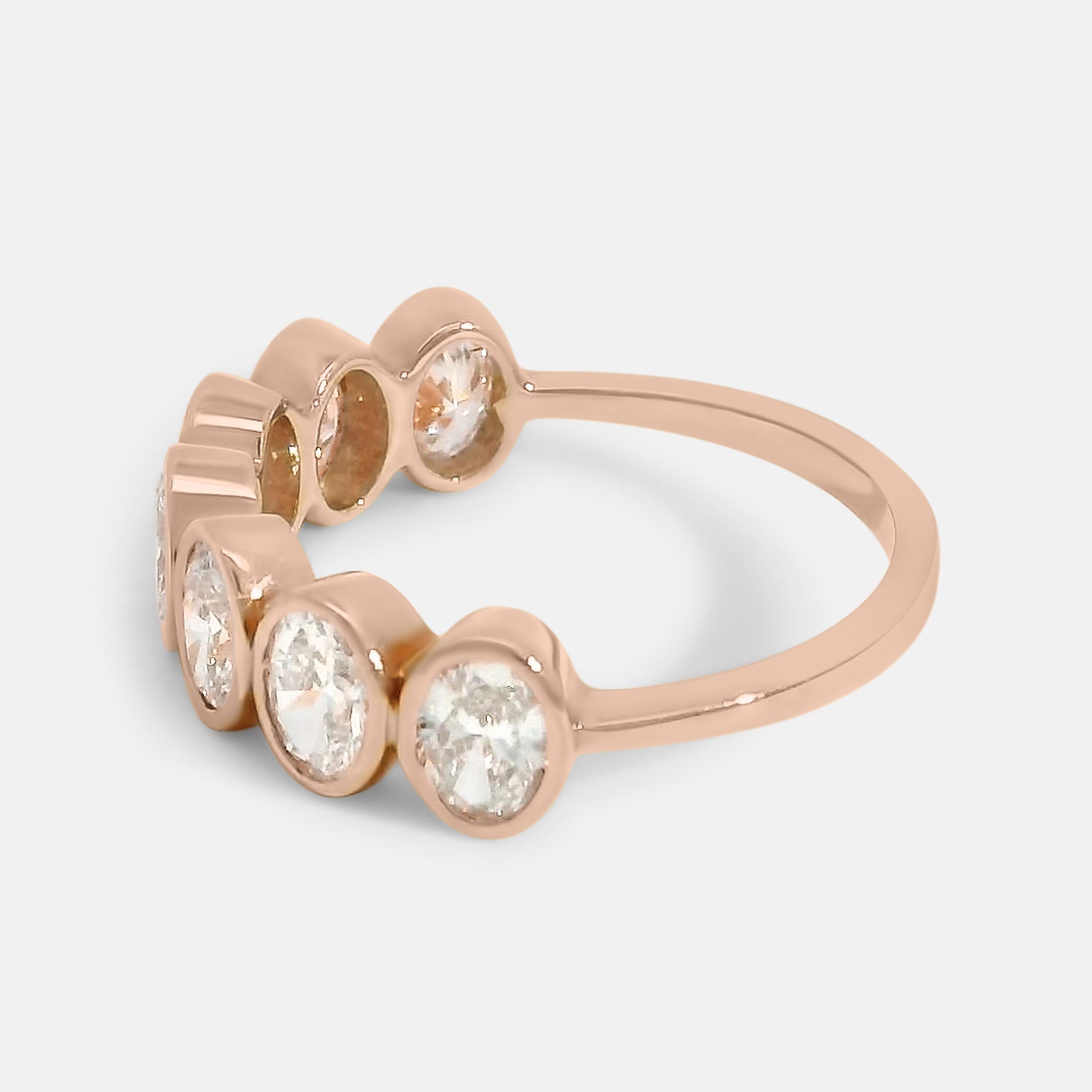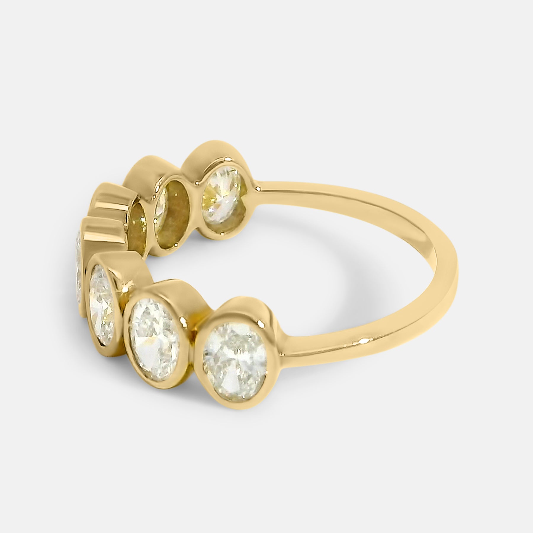 This elegant band features 7 oval diamonds in a bezel setting showcasing sparkling diamonds. This band offers a subtle yet sophisticated sparkle and is the perfect ring for everyday elegance or stacking.