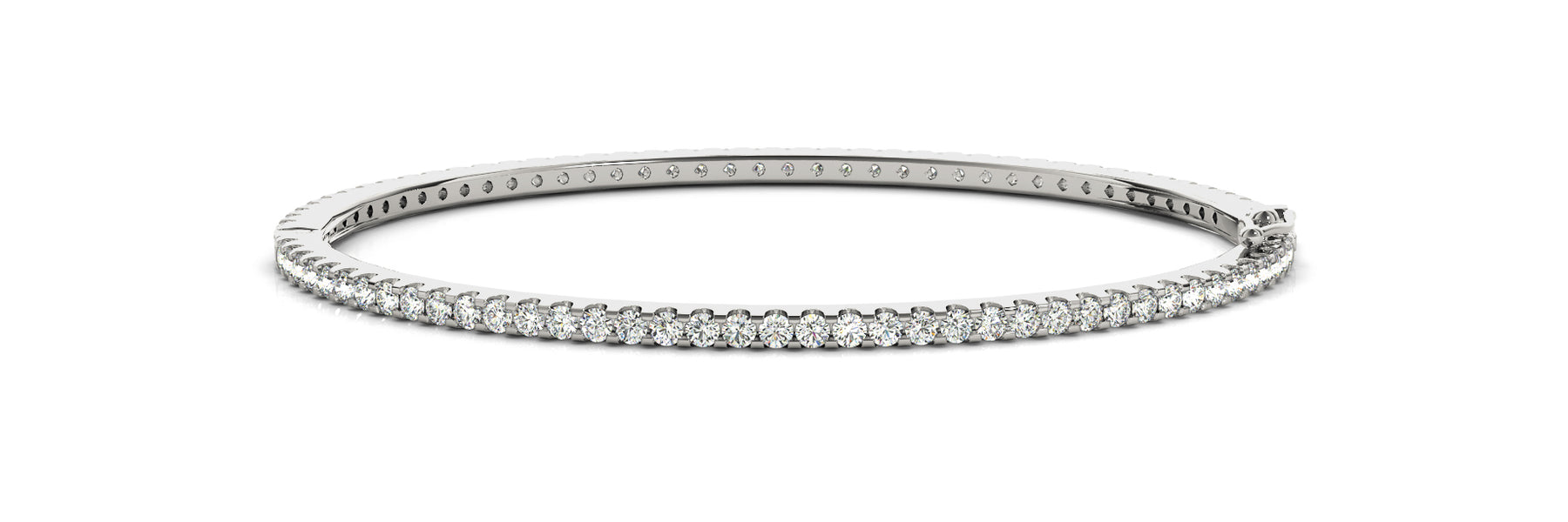Elegant bangle adorned with 115 round diamonds, totaling approximately 0.86 carats, with H-I color and I1 clarity.